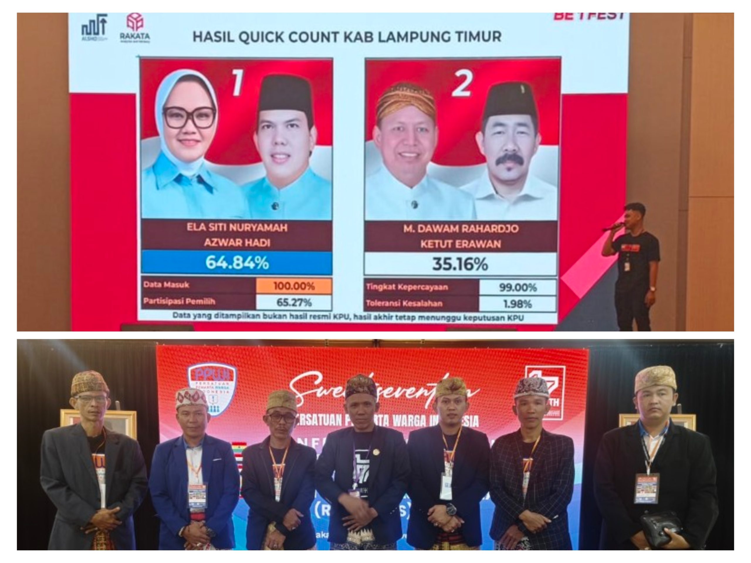 “Kami memperkirakan hasil penghitungan real count yang akan dipublikasikan KPU Lampung Timur tidak meleset jauh dari quick count Rakata. Melihat besarnya selisih perolehan suara dari kedua paslon, saya menyakini bahwa kemenangan Ela-Azwar, bukan hanya sekedar kemenangan Paslon Nomor 01 dan para tim suksesnya, namun kemenangan ini milik Masyarakat luas yang menginginkan Perubahan, sehingga Kabupaten Lampung Timur yang dikenal dengan Bumei Tuah Bepadan ini semakin maju dan makmur,” pungkas Sopyanto.