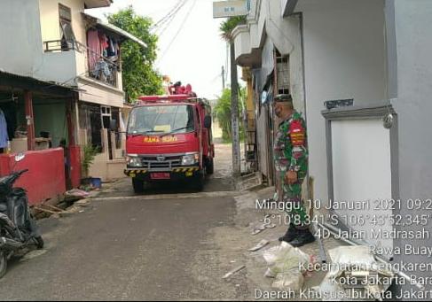 Anggota Koramil 04 Cengkareng Kodim 0503 Jakarta Barat, Babinsa Kel. Rawa Buaya, Pelda A Zaini bersama tiga pilar gelar Penyemprotan disinfektan di hari Minggu, 10 Januari 2021.