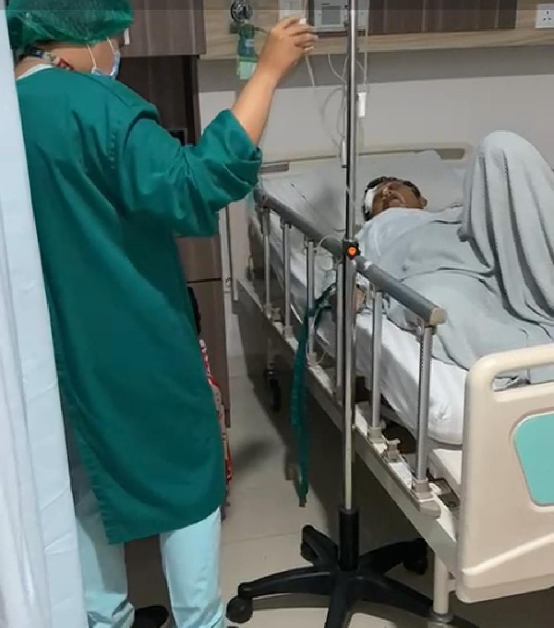 Saat ditangani petugas Medis ketika memasang jarum infus kondisi darah bapak sudah menghitam saat dokter memberikan keterangan bapak kekurangan cairan dan oksigen.