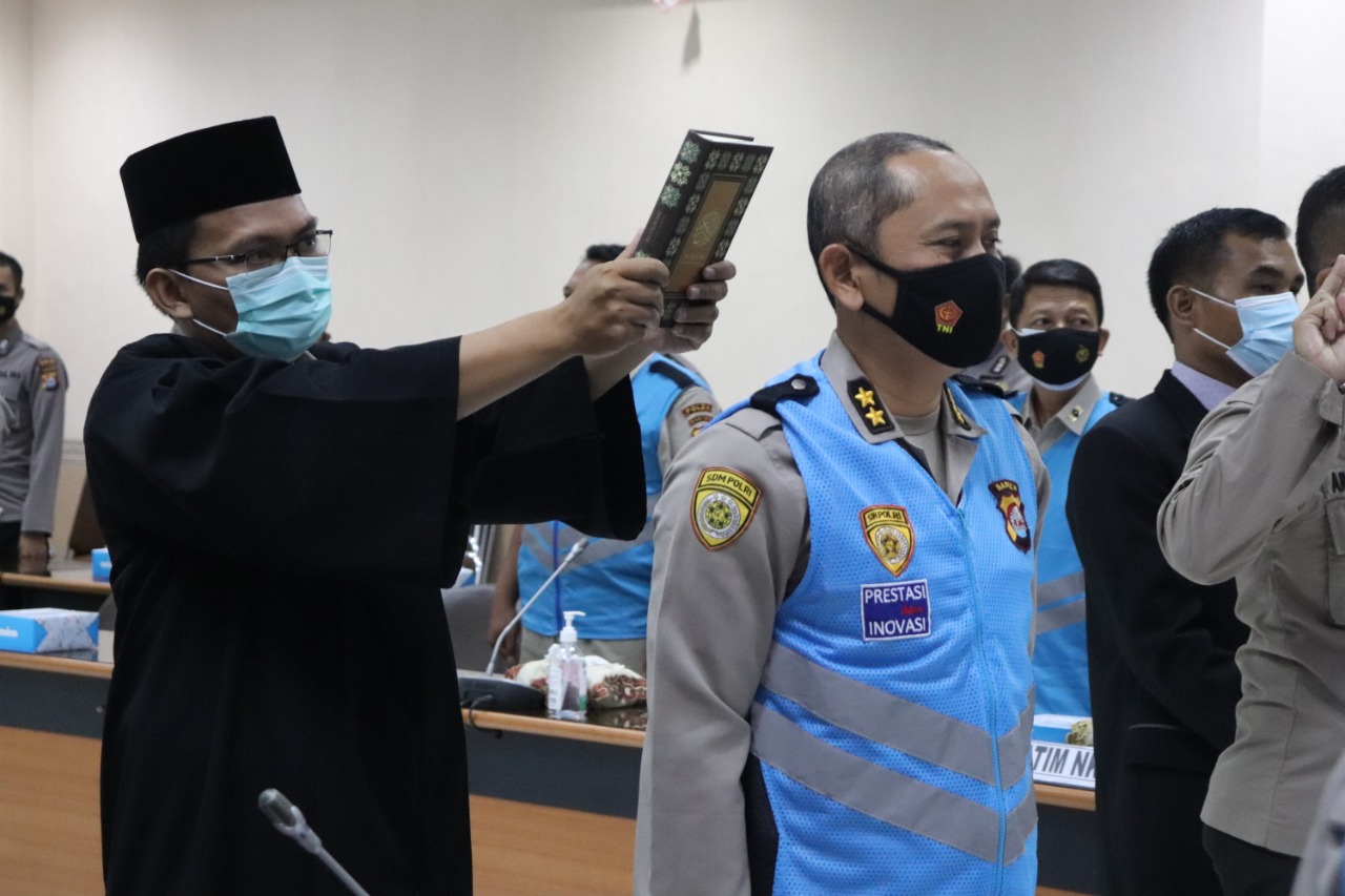 Brigjen Pol Drs. Ery Nursatari S.H.,M.H. memimpin acara pengambilan sumpah panitia dan peserta seleksi Pendidikan Sekolah Inspektur Polisi Angkatan 50 T.A. 2021 di ruang Rupatama Polda Banten.