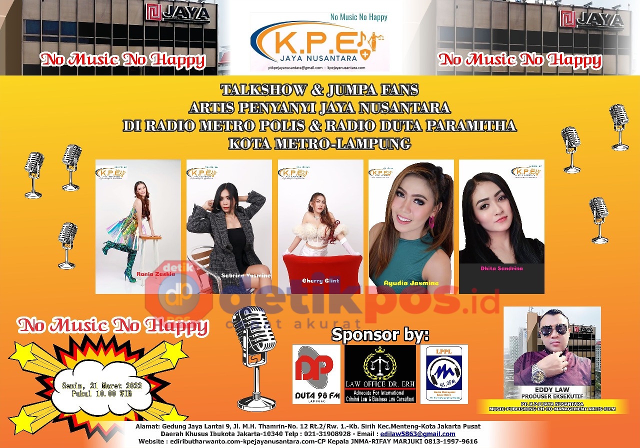 JPPOS.ID, JAKARTA—– lima penyanyi dari label musik KPE Jaya Nusantara Jakarta, akan hadir di Kota Metro Lampung , dalam rangka talk show dan promosi lima single yang akan dirilis pada pada bulan Maret 2022. Hal itu dikatakan kepala Jaya Nusantara Management Artis (JNMA) Rifay Marzuki dihadapan Awak media dikantor Gedung Jaya Lantai 9 Jakarta Pusat.