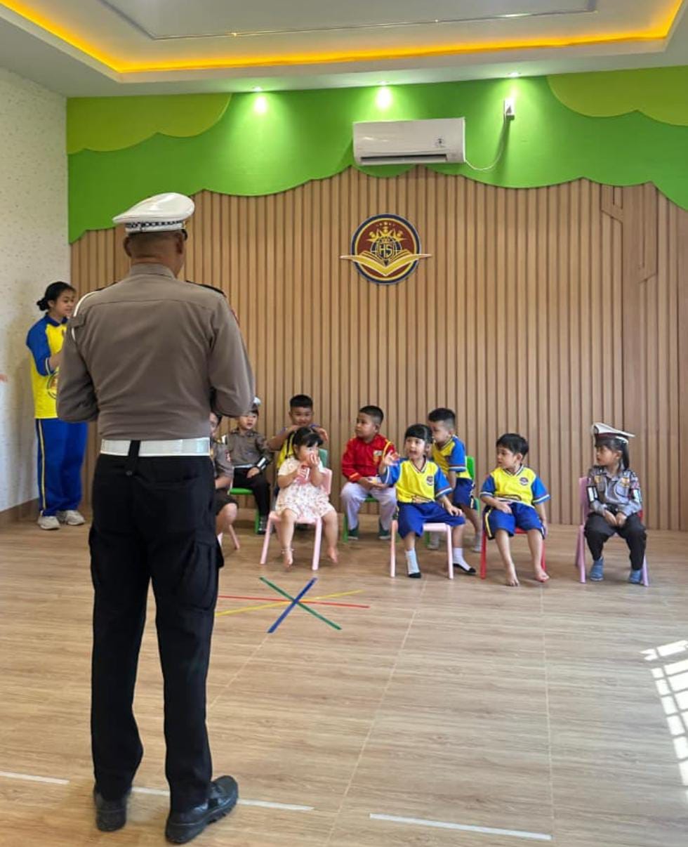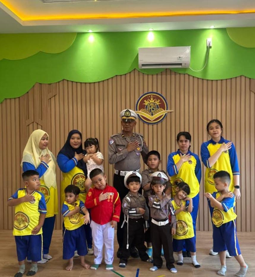 detikpos.id || Binjai. Harmoni Sentosa School hari ini mendapat kunjungan istimewa dari personel Polisi Lalu Lintas (Polantas) Polres Kota Binjai. IPDA Irwansyah selaku Kanit Kamsel Satlantas Polres Binjai dan AIPTU Jujurta Kaban datang ke sekolah untuk memberikan sosialisasi aman berkendara dan mengenal “traffic light” untuk anak-anak paud.