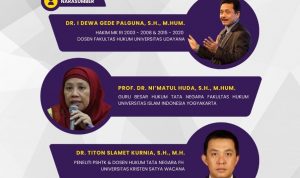 Talk Show kali ini menghadirkan 3 (tiga) narasumber berkompeten yaitu Dr. I Dewa Gede Palguna, S.H., M.Hum. (Hakim MK RI 2003-2008 & 2015-2020, Dosen Fakultas Hukum Universitas Udayana), Prof. Dr. Ni’matul Huda, S.H., M.Hum (Guru Besar Hukum Tata Negara Fakultas Hukum Universitas Islam Indonesia Yogyakarta), dan Dr. Titon Slamet Kurnia, S.H., M.H. (Peneliti PSHTK & Dosen Hukum Tata Negara FH Universitas Kristen Satya Wacana).