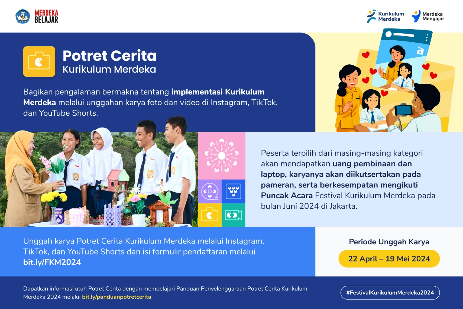 Simak lebih lanjut persyaratan kategori peserta, karya dan tema Potret Cerita dengan mengunduh panduan Potret Cerita pada tautan berikut bit.ly/panduanpotretcerita. Untuk informasi selengkapnya mengenai Festival Kurikulum Merdeka dapat mengunjungi laman Festival Kurikulum Merdeka berikut kurikulum.kemdikbud.go.id/festivalkurikulummerdeka dan ikuti informasi terbarunya pada Instagram Kurikulum Merdeka instagram.com/kurikulum.merdeka.