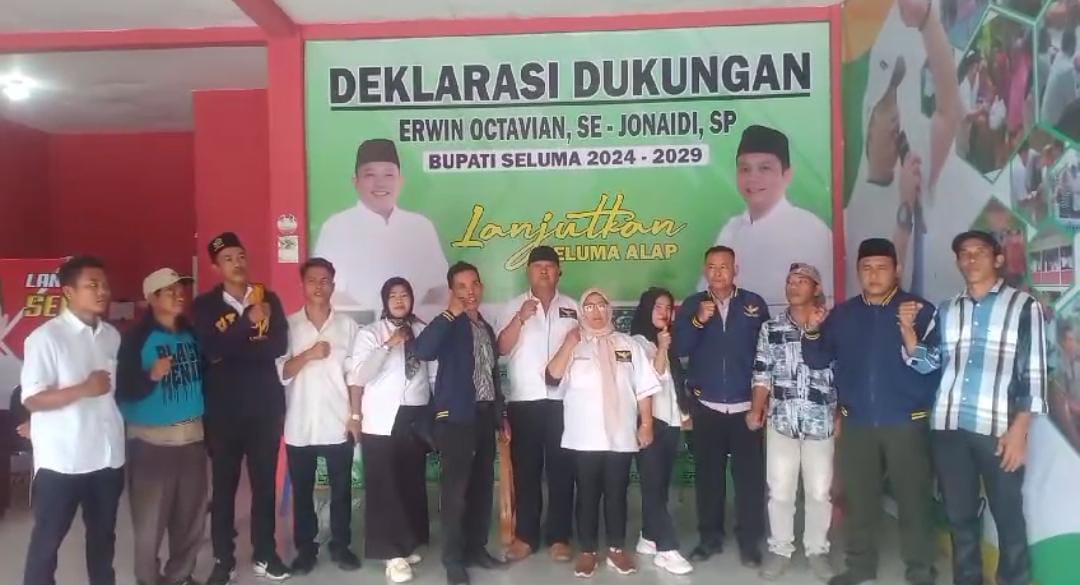 DETIKPOS.ID || BENGKULU SELUMA – Deklarasi ini dilakukan di Kantor posko kemenangan ERWIN OKTAVIAN,SE jalan lintas dua jalur tais kabupaten Seluma Sabtu (14/09/2024) Deklarasi dipimpin oleh ketua Doni Gotman SH, Sekjen Partai Deki Sapiktor,SPT ditemani oleh beserta jajarannya.