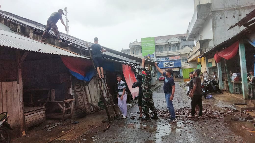 “Setibanya dilokasi kejadian ada beberapa toko yang asbesnya rusak berterbangan dampak diterjang angin puting beliung,” ujar Babinsa.
