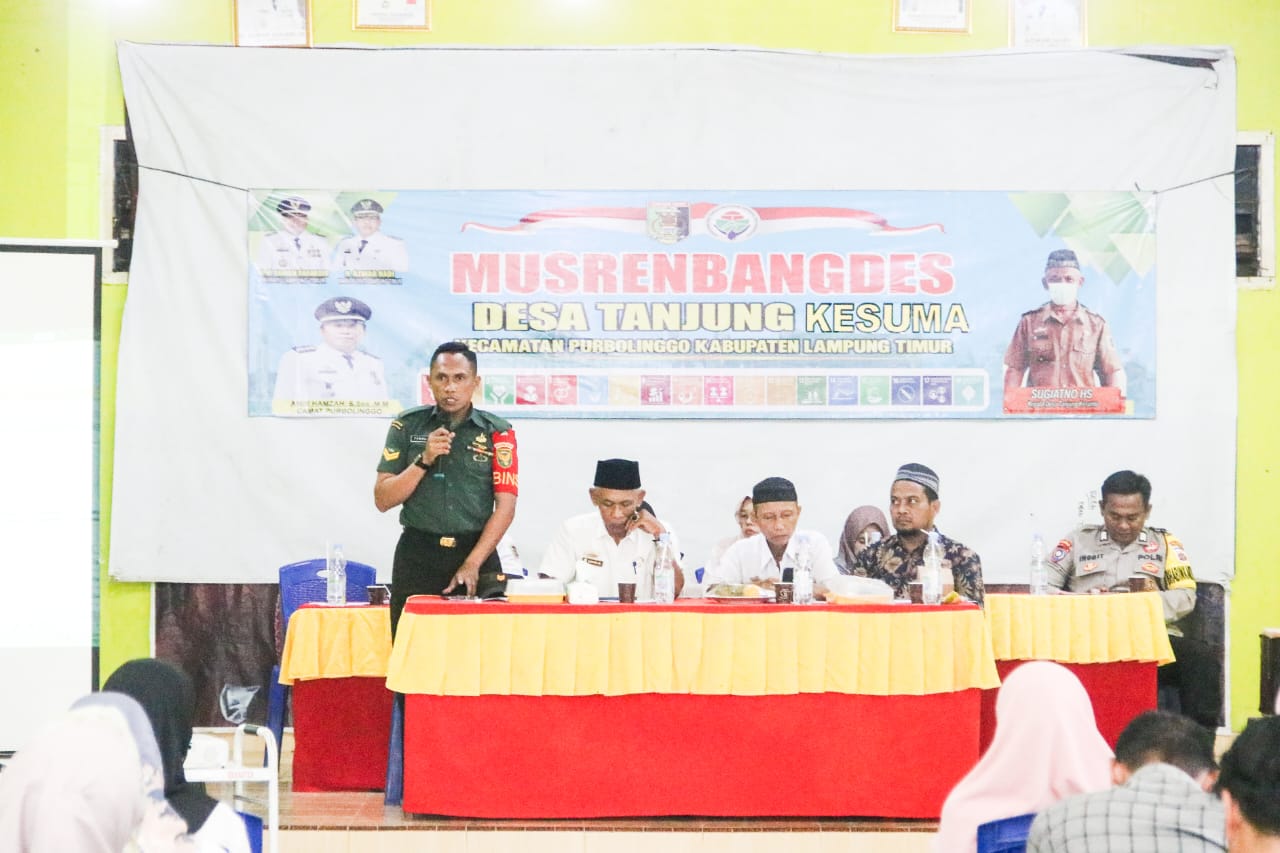 Detikpos.id, Lampung Timur — Bintara Pembina Desa (Babinsa) Koramil 429-06/Purbolinggo Kodim 0429/Lamtim menghadiri undangan Musyawarah Rencana Pembangunan Desa (Musrenbang Desa) dalam rangka Penyusunan rencana Kerja Pemerintah tahun 2024, di Balai Desa Tanjung Kesuma, Kecamatan Purbolinggo, Lampung Timur, Rabu (11/10/2023).