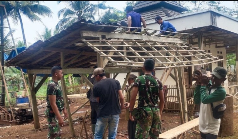 Terpantau pada Selasa, (25/7/2023) Satgas TMMD 117 bersama masyarakat bergotong royong mengangkat pondok tua dipindahkan ke lokasi lain yang nantinya dilokasi tersebut akan dibangun tempat wudhu dan MCK.