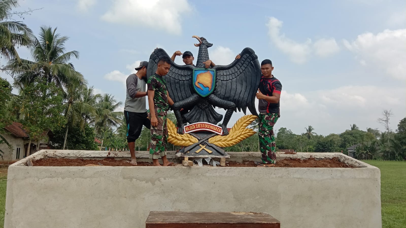 Terpantau pada Hari Minggu (30/7/2023), Personel Satgas TMMD ke-117 bersama masyarakat bahu membahu mengangkat lambang Garuda Hitam yang nantinya menjadi Ikon tugu monumen Desa Sumber Marga, Kecamatan Way Jepara.