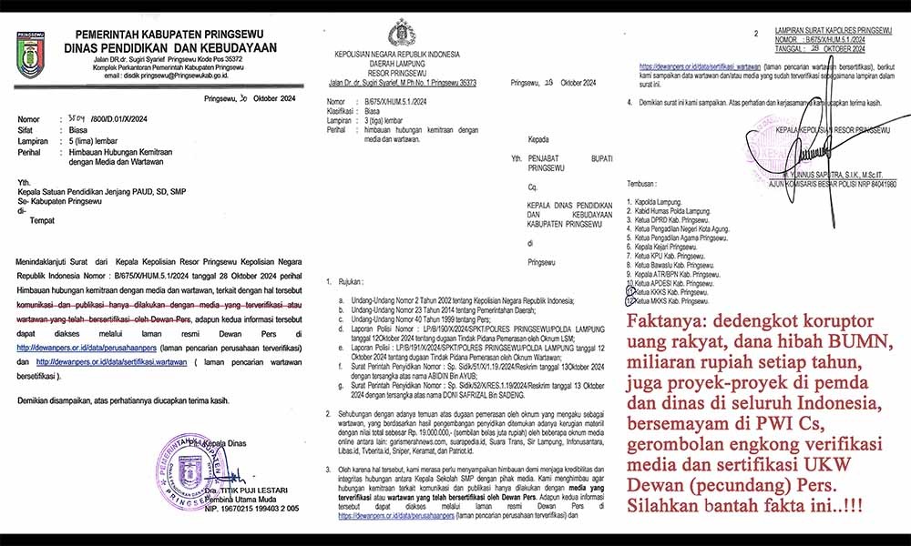 Detikpos.id, Jakarta – Surat Kapolres Pringsewu, AKBP M. Yunnus Saputra, Nomor B/675/X/HUM.5.172024 yang ditujukan kepada ke Bupati Pringsewu cq. Kepala Dinas Pendidikan Pringsewu, tentang hubungan kemitraan dengan media dan wartawan tertanggal 28 Oktober 2024 menuai polemik di di kalangan wartawan di Provinsi Lampung, khususnya di Kabupaten Pringsewu. Surat itu pada intinya berisi himbauan kepada lembaga-lembaga pendidikan (sekolah) agar tidak menjalin kerja sama dengan wartawan yang tidak bersertifikat UKW dan/atau media yang tidak terverifikasi Dewan Pers.