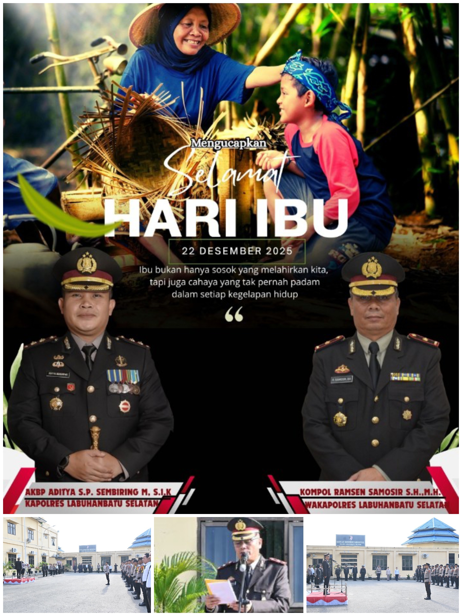 Polres Labuhanbatu Selatan melaksanakan upacara peringatan Hari Ibu ke-97 Tahun 2025 di halaman apel Polres Labuhanbatu Selatan, Jalan Lintas Sumatera Kotapinang–Gunung Tua, Desa Sosopan, Kecamatan Kotapinang, Kabupaten Labuhanbatu Selatan, Senin (22/12/2025).