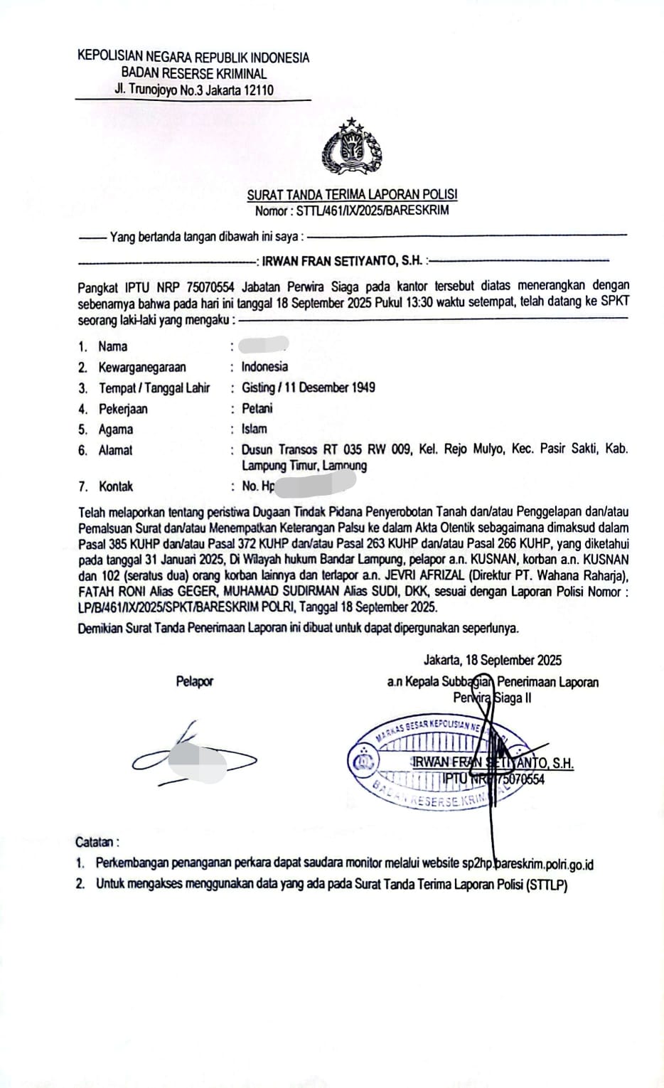 detikpos id. _JAKARTA — Kasus dugaan penyerobotan tanah bersertifikat Hak Milik (SHM) milik warga Desa Rejomulyo, Kecamatan Pasir Sakti, Lampung Timur, kini resmi ditangani aparat kepolisian setelah Mabes Polri menerima laporan masyarakat secara langsung pada 18 September 2025. Laporan tersebut tercatat dalam Surat Tanda Terima Laporan Polisi (STTLP) Mabes Polri dengan nomor STTL/461/IX/2025/BARESKRIM.